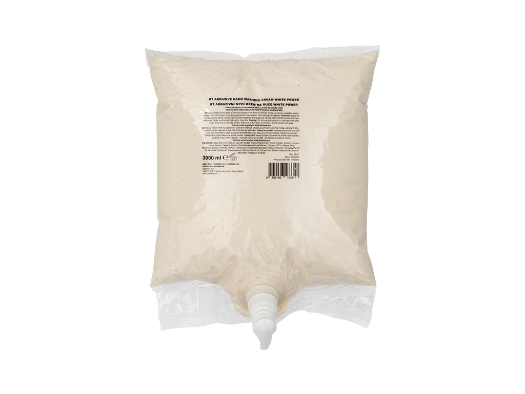 Tekutý mycí krém na ruce k odstranění odolných nečistot. Vhodné pro průmysl, strojírenství, automotive, i domácí použití (DIY). Obsahuje přírodní rostlinná mýdla, šetrná mikronizovaná abraziva, extrakt z aloe. Respektuje přirozenou rovnováhu pH pokožky a zanechává ruce jemné a příjemně vonící. Dermatologicky testováno. Vlastnosti: Hloubkový čisticí účinek. Obsahuje rostlinná mýdla, šetrná abraziva a extrakt z aloe. Rostlinná abraziva: uhličitan vápenatý (calcium carbonate). Neutrální pH. Použití: na suché ruce, opláchnout. Barva: bílá. Balení: 3 l bag (sáček) - cca 1200 dávek.Doplňkové parametry