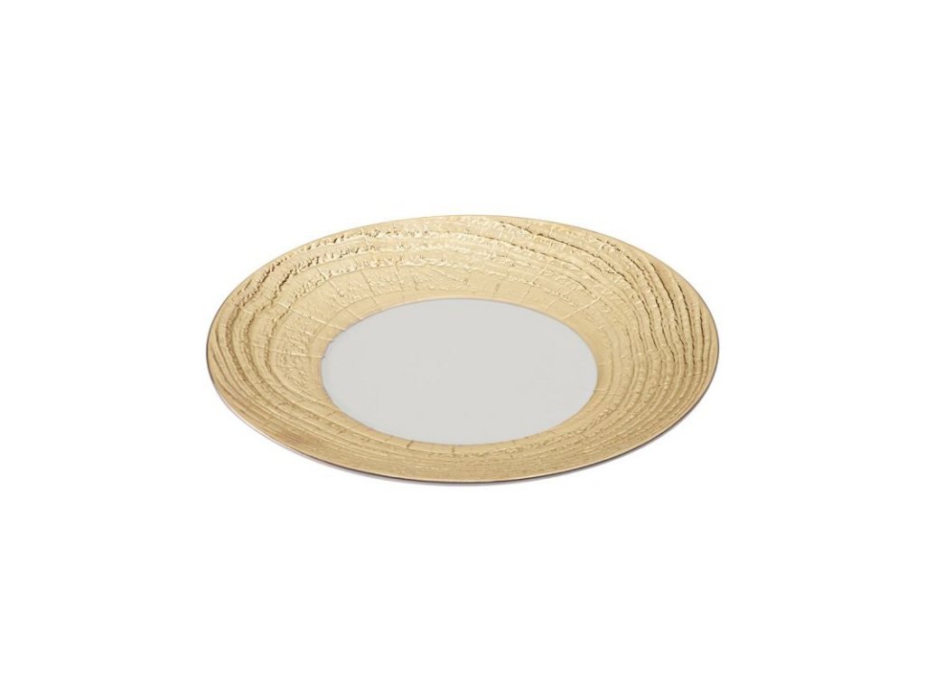 Arborescence talíř zdokonalí vaše kulinářské umění svým jedinečným designem napodobujícím kůru stromu, kterou zdobí zlato. Kromě estetické stránky vás nadchne i svou kvalitou, která odpovídá náročným požadavkům profesionálních šéfkuchařů. Je tak ideální volbou pro servírování jakýchkoliv gurmánských jídel. Kombinace slonové kosti se zlatou vám umožní hrát si s texturami a kontrasty. Jeho velká plocha pomůže vnést do vašich jídel ještě více elegance. Protože talíř zdobí zlaté prvky, neměl by být používaný v troubě nebo mikrovlnce a doporučuje se pouze ruční mytí.Talíř klubový pr. 31 cm, zlatý