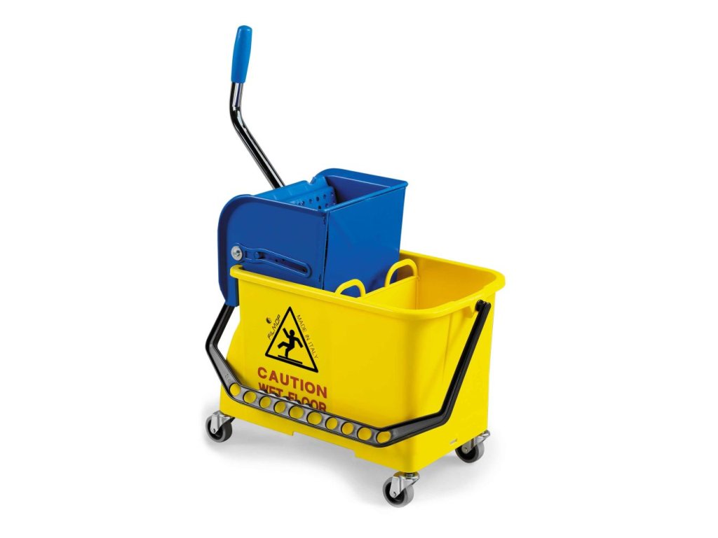 - úklidový vozík SPIDER, plastový - vozík obsahuje 1 žlutý kbelík na 15 l rozdělený vysouvací přepážkou na dvě části s výstražným nápisem, ždímač mopu, 4 kolečkaDoplňkové parametry