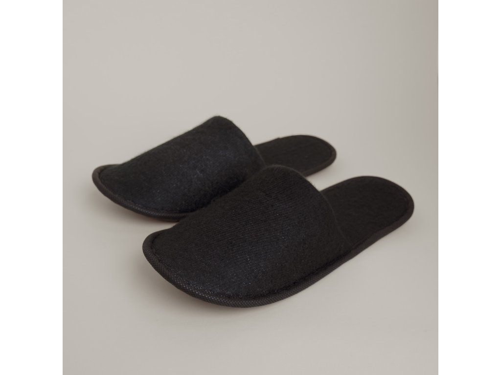 Hotelové pantofle BASIC NAP CLOTH 30 cm protiskluzové Černé hotelové pantofle basic kombinují eleganci a funkčnost. Tyto jednorázové pantofle s uzavřenou špičkou disponují 4mm prostiskluzovou podrážkou Eco EVA, která zaručuje pohodlí a bezpečnost pohybu vašich hostů. Každý pár je hygienicky zabalen do sáčku z biologicky rozložitelného materiálu z kukuřičného škrobu, což zajišťuje nejen čistotu pantoflí před použitím, ale také ohleduplnost k životnímu prostředí.Černé jednorázové pantofle jsou dostupné v univerzální velikosti a dodají každému hotelovému nebo wellnes zařízení nádech luxusu. Na přání je možné opatřit pantofle výšivkou nebo potiskem. Minimální objednávka logovaných pantoflí činí alespoň 3000 párů.V takovém případě je dodání zajištěno do 5-6 týdnů od objednání. Preferujete-li variantu bez loga, pantofle vám odešleme obratem.VZOREK K ZASLÁNÍ ZDARMA Minimální objednávka: 100 párů/1 karton Doprava: ZDARMA pro objednávky nad 5 000 Kč bez DPHDoplňkové parametry