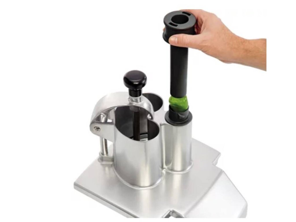 - 1 x pěchovadlo Exactitube o průměru 39 mm – na krájení drobných plodů jako jsou papričky, nakládané okurky, suché salámy, chřest, raná cibulka, banána, jahody, hrozny
