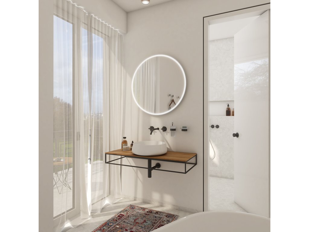 LED zrcadlo 600x600 Koupelnové podsvícené LED zrcadlo. Výkon 26 W, teplota chromatičnosti 6000 K. 1872 Lumen.Nová technologie svícení za použití akrylátového skla, plexiglass. Konstrukce pro uchycení zrcadla je z hliníkového rámu 32x19 mm, sklo zrcadla má tloušťku 5 mm. Průměr zrcadla 600 mm. Led pásky jsou ukryté v PVC tubě za sklem zrcadla. Světlo prochází skrz sklo a odráží se po celém obvodu zrcadla, tím vytváří i zajímavý světelný efekt na stěně. Připojení 220-240 V. Ochrana IP 44. Zrcadlo je bez vypínače. Zapojení zrcadla je do el. rozvodu a jeho zapínání je přes vypínač světel v místnosti. LED čipy mají vysoký výkon. Barevná teplota svítivosti je denní bílá – jasné polední světlo. Životnost LED diod je až 50 000 hodin.Doplňkové parametry