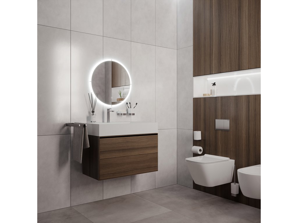 LED zrcadlo 800x800 s dotykovým senzorem Koupelnové podsvícené LED zrcadlo. Výkon 29 W. Možnost nastavení teploty svítivosti od 2700 - 6000 K. 2088 Lumen.Nová technologie svícení za použití akrylátového skla, plexiglass. Konstrukce pro uchycení zrcadla je z hliníkového rámu 32x19 mm, sklo zrcadla má tloušťku 5 mm. Průměr zrcadla 800 mm. Led pásky jsou ukryté v PVC tubě za sklem zrcadla. Světlo prochází skrz sklo a odráží se po celém obvodu zrcadla, tím vytváří i zajímavý světelný efekt na stěně. Připojení 220-240 V. Ochrana IP 44. Zapínání / vypínání / ovládání je pomocí dotykového senzoru s pamětí. Možnost nastavení barevné teploty svícení od studené bílé až po teplou bílou. LED čipy mají vysoký výkon. Životnost LED diod je až 50 000 hodin.Doplňkové parametry