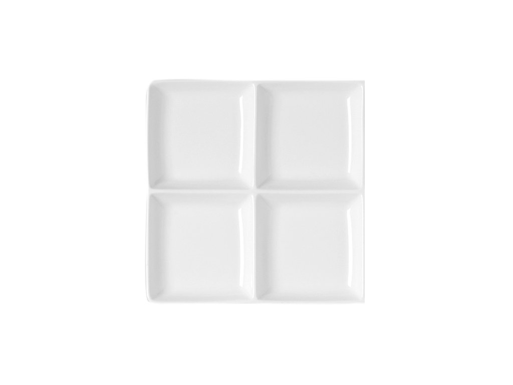Jednoduchý design rozdělený na 4 části nabízí širokou škálu možností k modernímu a vkusnému servírování a prezentování jakýchkoliv pokrmů rozdělených pomocí segmentů tohoto kousku. Talíř lze použít samostatně nebo harmonicky kombinovat s jinými sériemi. Odolnost porcelánu dodává na kvalitě a dlouhodobé výdrži i v intenzivním provozu.Talíř čtvercový, 4 segmenty 20 × 20 cm