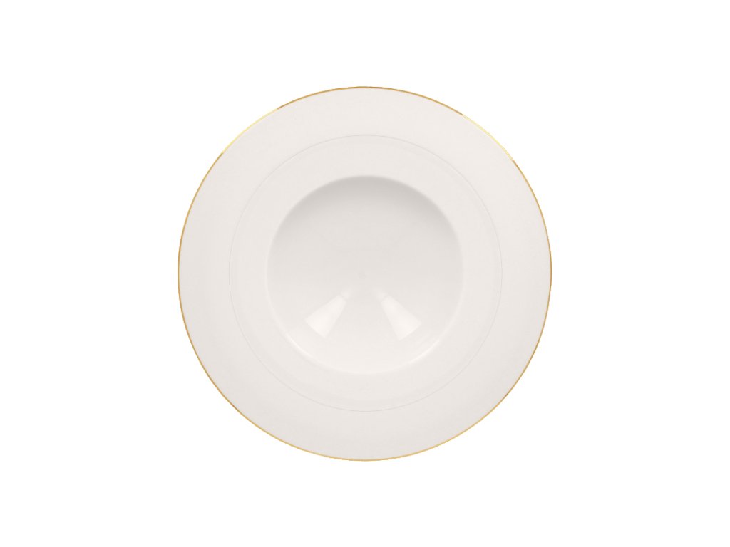 Tento talíř dodává pokrmům pocit luxusu díky propracovanému designu a také uvolňující nádech jako při pohledu na vycházející slunce. Bílé provedení se zlatým okrajem poskytuje parádní plátno pro servírování těch nejlepších kulinářských výtvorů. Kvalitní porcelán přispívá na kvalitě v podobě dlouhodobé životnosti a odolnosti proti poškození.Talíř hluboký pr. 23 cm