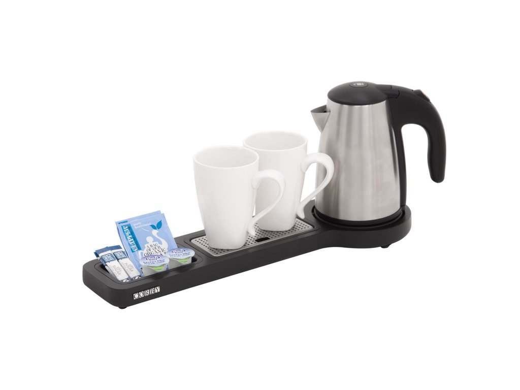 Rychlovarný set Beckett Compact Corby Rychlovarný set Beckett Compact v černé barvě má kompaktní rozměr a elegantní vzhled , který snadno zapadne do designu jakéhokoliv pokoje. Je plně certifikovaný s označením CE. Set obsahuje rychlovarnou konvici s objemem 0,6 l a zabezpečením proti odcizení a podnos z voděodolné desky MDF, který je vybaven gumovými nožičkami proti poškrábání povrchu. Jeho součástí je i snadno vyjímatelná odkapávací miska z nerezové oceli pro snadnější čištění.Zlepšete si den šálkem lahodné kávy nebo čaje kdykoliv na něj dostanete chuť. Stačí jen sáhnout po rychlovarném setu, kde najdete vše, co k přípravě budete potřebovat. Upozornění: Hrnečky nejsou součástí balení. Minimální objednávka: 1 ks Doprava: ZDARMA u objednávek nad 5 000 Kč bez DPHDoplňkové parametry